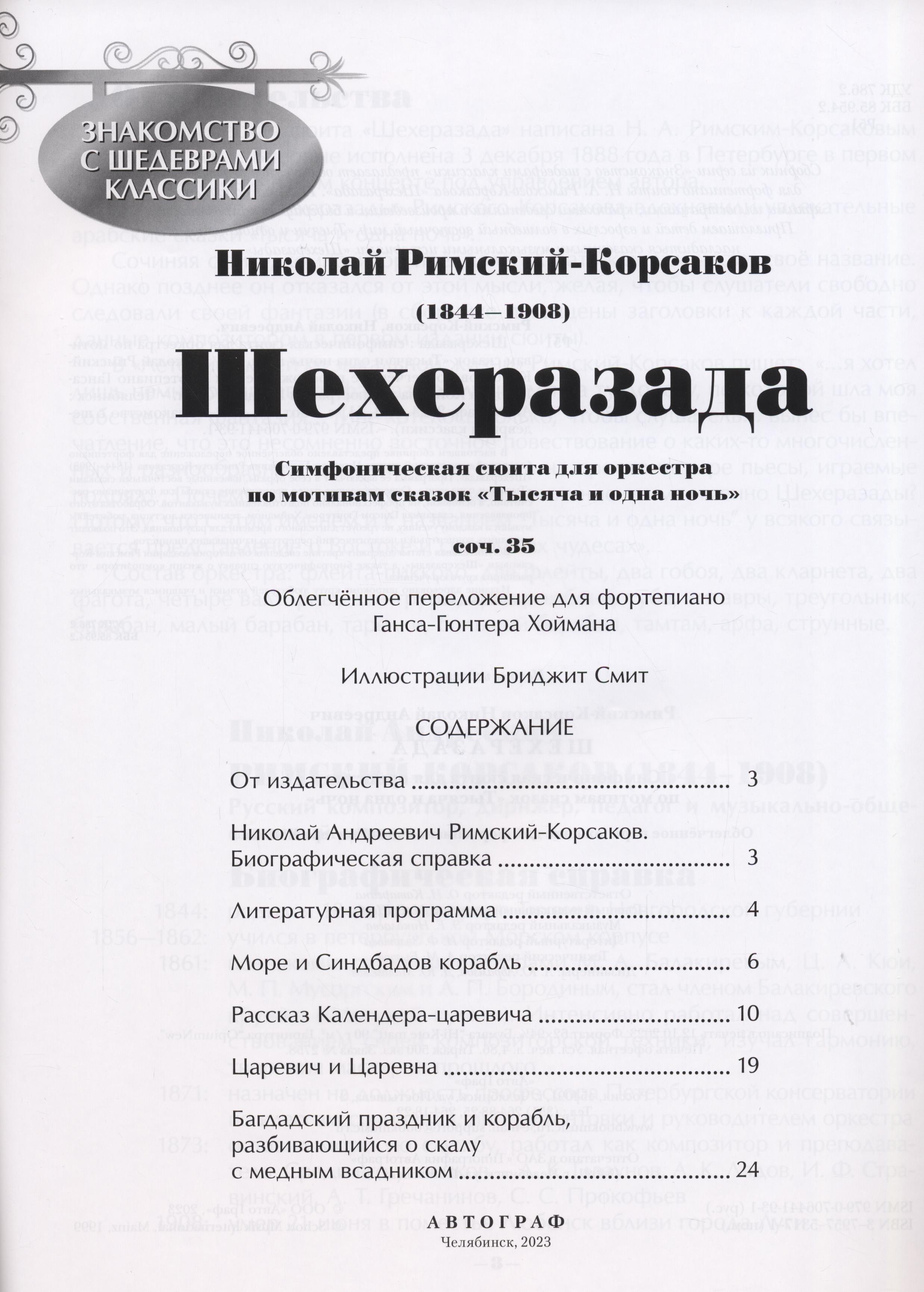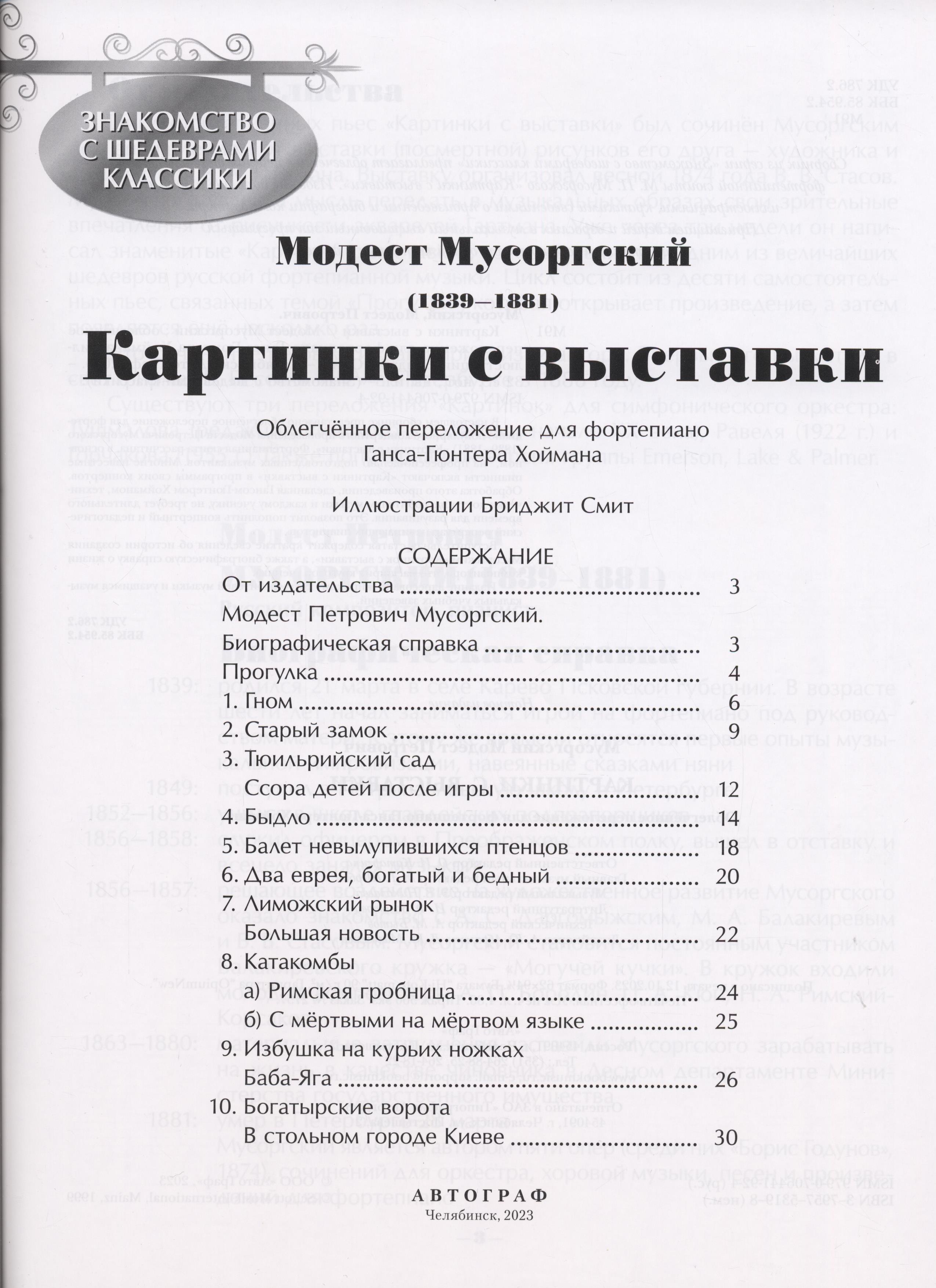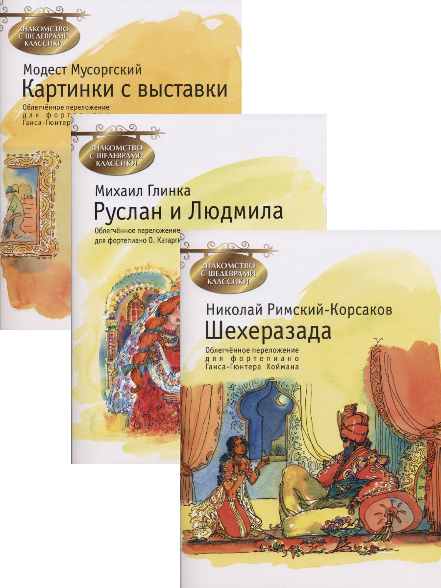 В комплект вошли облегчённые переложения сочинений М.Мусоргского "Картинки с выставки", М.Глинки "Руслан и Людмила", Н.Римского-Корсакова "Шехерезада".