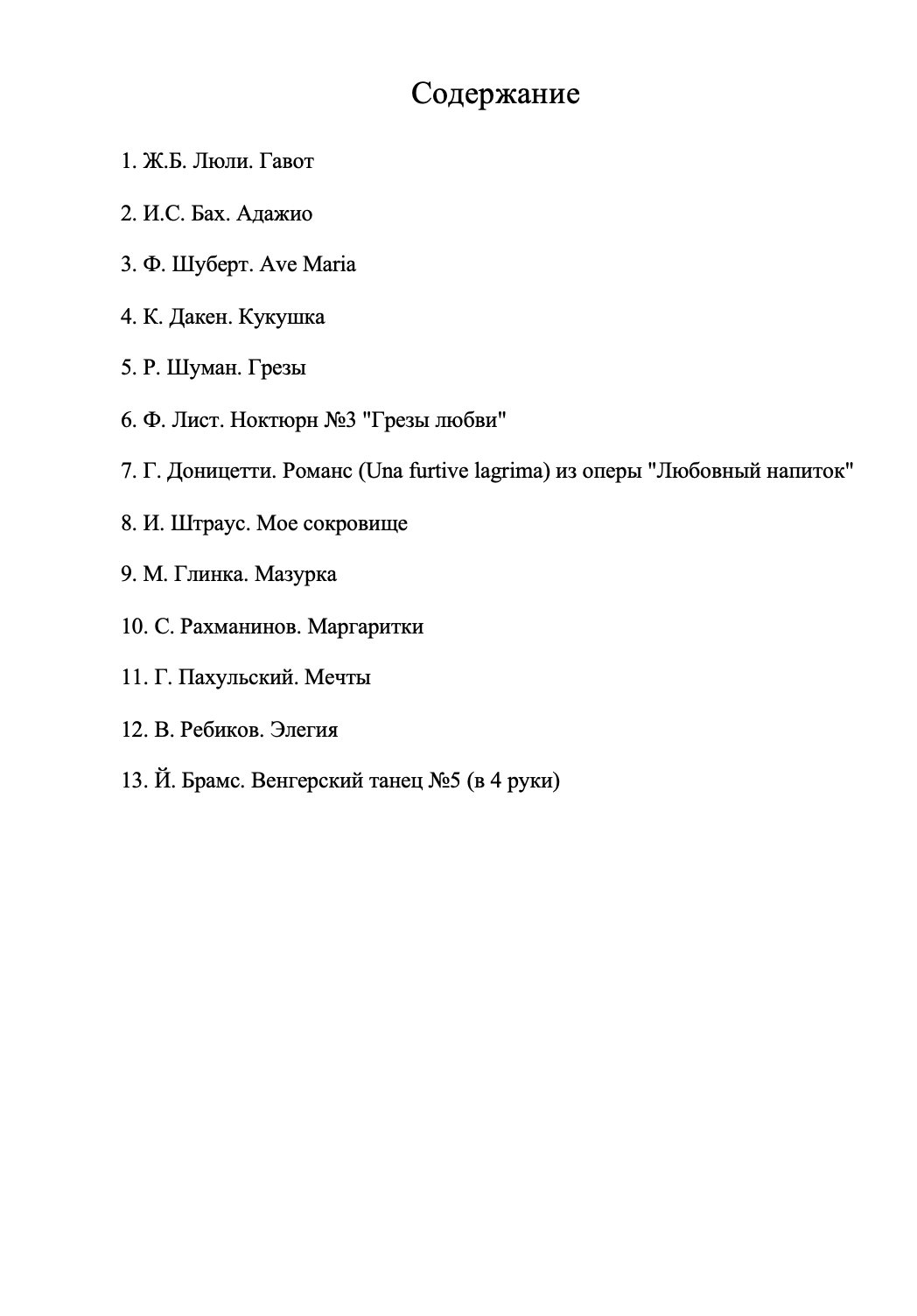 В сборник вошли произведения различных жанров, стилей, эпох, представляющие собой популярнейшие образцы мировой музыкальной культуры. Предназначается для широкого круга любителей музыки. Содержание: Ж.Б. Люли. Гавот; И.С. Бах. Адажио; Ф. Шуберт. Ave Maria; К. Дакен. Кукушка; Р. Шуман. Грезы; Ф. Лист. Ноктюрн №3 "Грезы любви"; Г. Доницетти. Романс (Una furtive lagrima) из оперы "Любовный напиток"; И. Штраус. Мое сокровище; М. Глинка. Мазурка; С. Рахманинов. Маргаритки; Г. Пахульский. Мечты; В. Ребиков.Элегия; Й. Брамс. Венгерский танец №5 (в 4 руки).