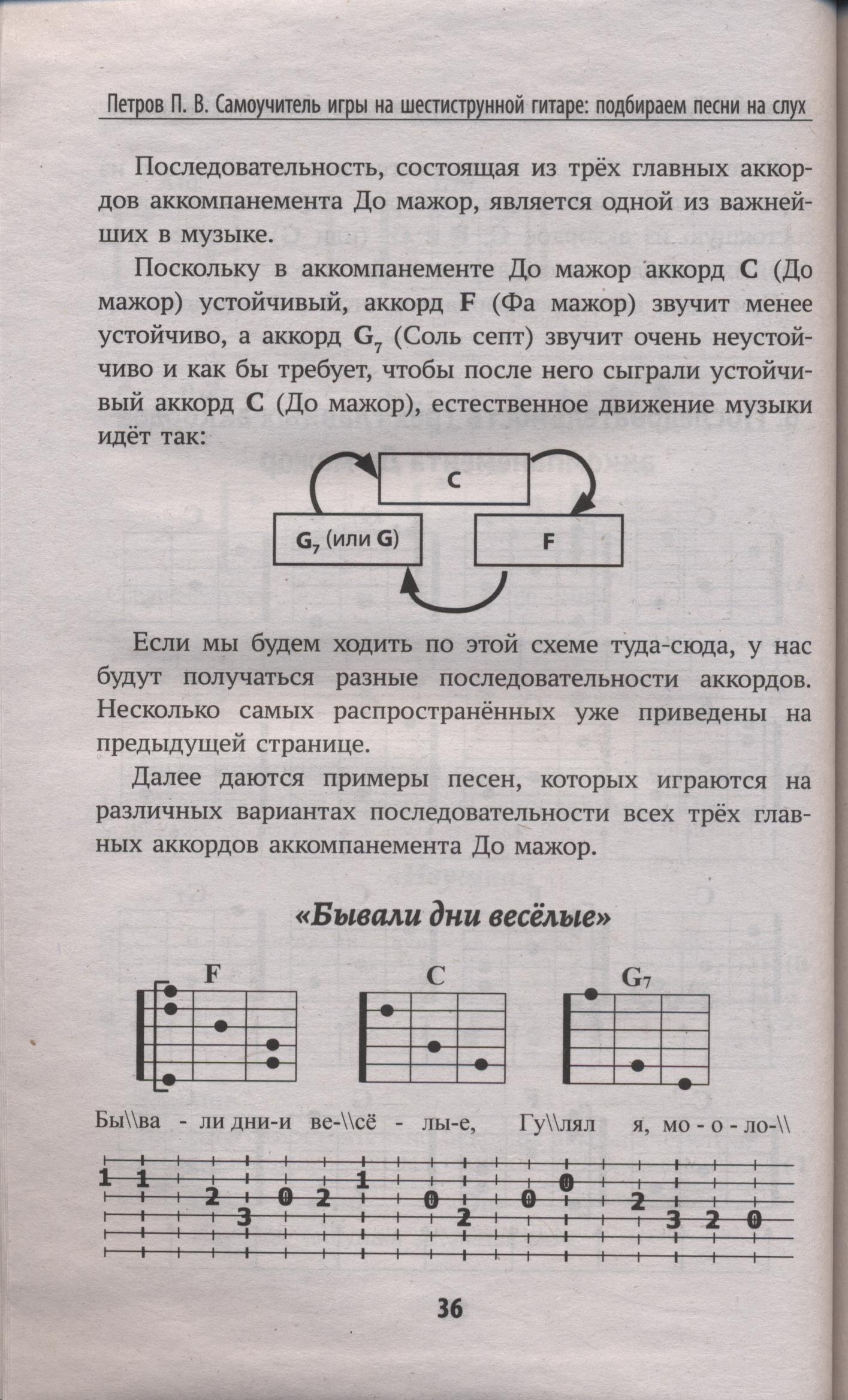 Книга написана в помощь тем, кто хочет научиться подбирать песни на слух. В ней рассказывается о стандартных аккордовых последовательностях, на которых играются песни. Этих последовательностей немного, и они хорошо известны музыкантам-профессионалам. Учебник и вас научит узнавать эти последовательности на слух, слышать их в песнях и подбирать аккорды к песням. Песенные примеры в учебнике помогут вам этому научиться.
