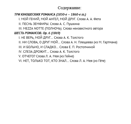ТРИ ЮНОШЕСКИХ РОМАНСА (1850-е – 1860-е гг.) I. МОЙ ГЕНИЙ, МОЙ АНГЕЛ, МОЙ ДРУГ. Слова А. А. Фета II. ПЕСНЬ ЗЕМФИРЫ. Слова А. С. Пушкина III. MEZZA NOTTE (ПОЛНОЧЬ). Слова неизвестного автора ШЕСТЬ РОМАНСОВ. Op. 6 (1869) I. НЕ ВЕРЬ, МОЙ ДРУГ… Слова А. К. Толстого II. НИ СЛОВА, О ДРУГ МОЙ… Слова А. Н. Плещеева (из М. Гартмана) III. И БОЛЬНО, И СЛАДКО… Слова Е. П. Ростопчиной IV. СЛЕЗА ДРОЖИТ… Слова А. К. Толстого V. ОТЧЕГО? Слова Л. А. Мея (из Гейне) VI. НЕТ, ТОЛЬКО ТОТ, КТО ЗНАЛ… Слова Л. А. Мея (из Гёте)