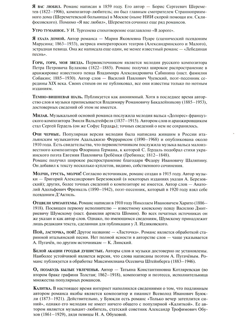 Старинные романсы всегда находили путь к человеческим сердцам; они входили в репертуар многих выдающихся исполнителей - Ф.Шаляпина, И.Козловского, Н.Обуховой, М.Максаковой, Е.Образцовой и др. Нередко сами же исполнители были и авторами романсов - к примеру, актриса Мария Пуаре ("Я ехала домой"), певец Михаил Вавич ("Грусть и тоска безысходная"). Имена многих создателей безвестны, но их сочинения получили столь широкое распространение, что стали поистине народными - интерес к жанру русского романса не утрачен и по сей день.